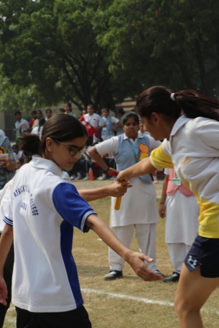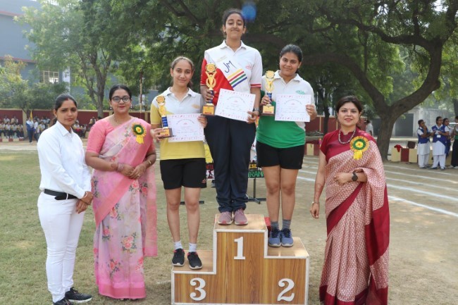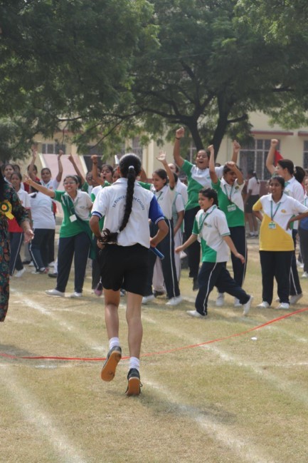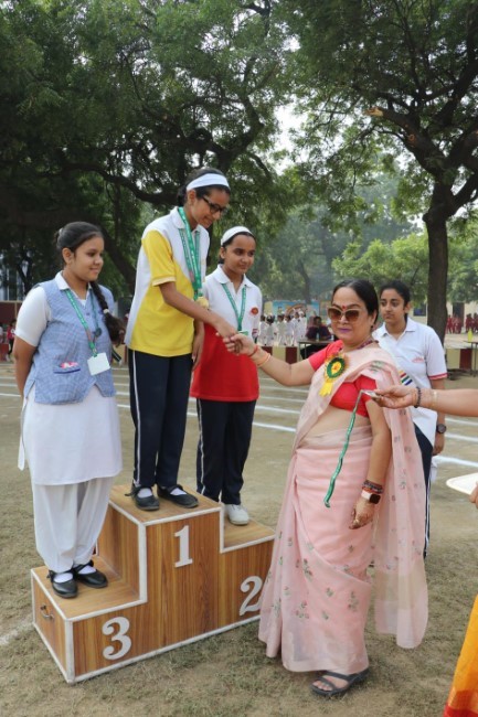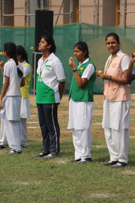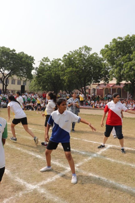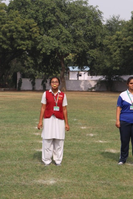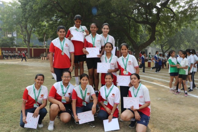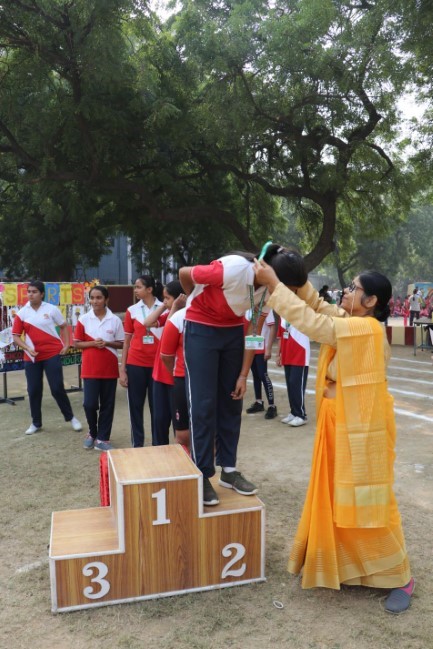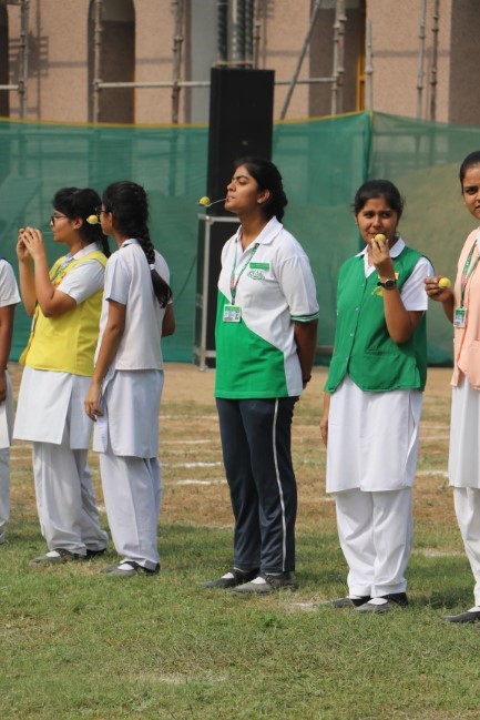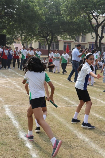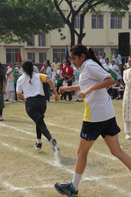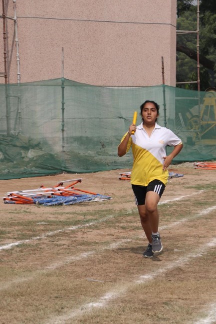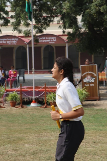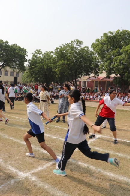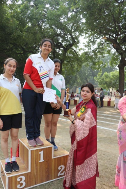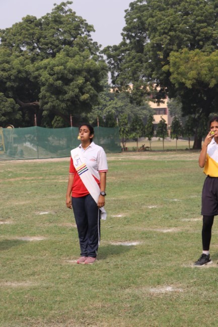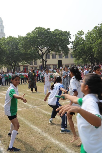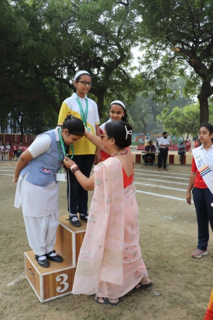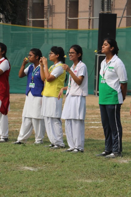 The event started with the March Past performed by the four houses of the school led by the Cabinet Members followed by the Torch Bearing Ceremony. The torch bearers were Shrinika Bhatia, who was the Best Athlete for the academic session 2022-23 in the Sub-Junior Category handed over to Gauri Kaushal, the Best Athlete for the Junior Category and further handed over to Samridhi Sharma, the Sports Captain of the College.